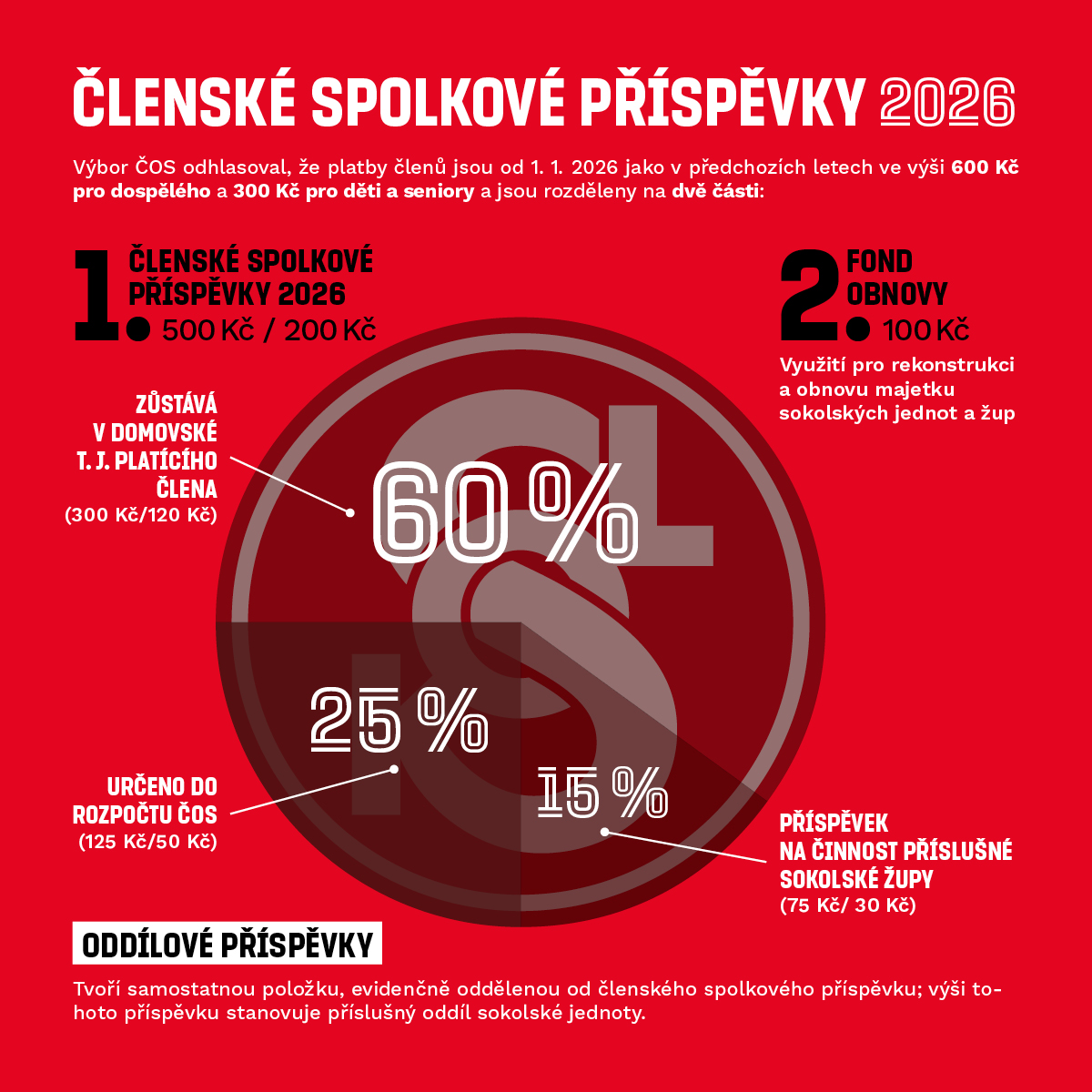 Proč se platí členská známka? Kdo disponuje vybranými penězi a k čemu je využívá? To shrnuje grafika připravená ústředím České obce sokolské. Rozdělení financí se oproti roku 2026 nemění.